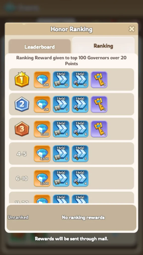 • Leaderboard rewards awarded to the top 100 players on your server with the highest points, which include gems and speedups.