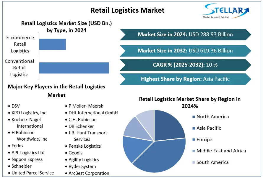 The Retail Logistics Market size was valued at USD 288.93 Bn. in 2024 and the Retail Logistics revenue is expected to grow at a CAGR of 10% from 2025 to 2032, reaching nearly USD 619.36 Bn. by 2032.