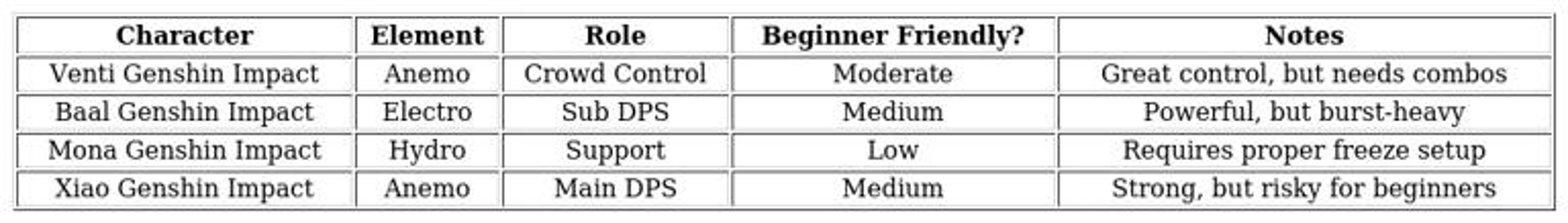 - Venti: Excellent crowd control, great for new players learning enemy patterns.