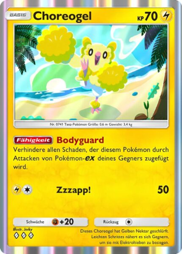 Choreogel bietet durch seine Fähigkeit „Bodyguard“ einen zuverlässigen Schutz vor Angriffen gegnerischer Pokémon-EX. Aufgrund dieser Fähigkeit können die stärksten Angreifer im aktuellen Format meist keinen Schaden an Choreogel verursachen. Es ist jedoch wichtig zu beachten, dass Choreogel weiterhin Schaden durch Fähigkeiten oder spezielle Zustände erleiden kann. Während deiner Spielrunde solltest du Choreogel als eine Art Schutzwall positionieren, indem du es auf das Spielfeld stellst, während du gleichzeitig Mega-Ampharos-EX auf der Bank vorbereitest, um deine Strategie optimal umzusetzen.