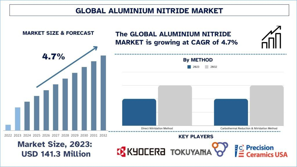 According to the UnivDatos analysis, the Demand for High-Performance Electronics, increasing renewable energy, and Advancements in Aerospace and Defense would drive the global scenario of the Aluminium Nitride market. As per their “Aluminium Nitride Market” report, the global market was valued at USD 141.3 Million in 2023, growing at a CAGR of 4.7% during the forecast period from 2024 - 2032 to reach USD Million by 2032.