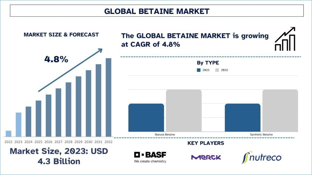 The betaine market encompasses the producing, distribution, and consumption of betaine, an obviously going on compound placed in several assets which incorporates sugar beets, spinach, and complete grains. Betaine is used in a huge range of applications which encompass food and drink, animal feed, cosmetics, and prescription drugs. In the food and beverage employer, its skills as a flavour enhancer and stabilizer, at the identical time as in animal feed, it improves growth and feed performance. In cosmetics and private care merchandise, betaine serves as a moisturizing agent, and in pharmaceuticals, it is hired for its ability fitness advantages. According to the UnivDatos analysis, the increasing consumer demand for health & wellness products, advancements in livestock productivity, expanding applications in personal care, & supportive government policies are driving the market's growth in the global scenario of the Betaine market. As per their “Betaine Market” report, the global market was valued at USD 4.3 Billion in 2023, growing at a CAGR of 4.8% during the forecast period from 2024 - 2032 to reach USD Billion by 2032.