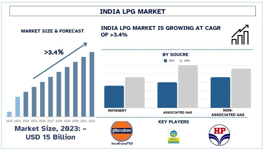 According to the UnivDatos, The India LPG Market was valued at 15 billion in 2023 and growing at a CAGR of ~3.4% during the forecast period from 2024 – 2032. Liquefied Petroleum Gas (LPG) consumption has emerged as a vital source of energy in India especially in the domestic sector for cooking purposes which have played a major role in fulfilling energy security and achieving sustainable development. They have various forms of energy sources, recent government policies, changes in consumption patterns, and the volatility in the present situation of LPG prices in India have marked the present scenario of the LPG market of India. However, the growth of the import and export market has also contributed a lot to determining the nature of the market. This concern focuses on the above-highlighted aspects to give a general understanding of the LPG market in India.