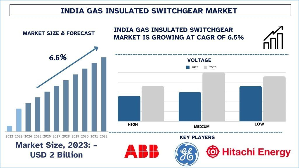 According to a new report by UnivDatos, The India Gas Insulated Switchgear Market was valued at USD 2 Billion in 2023 and growing at a CAGR of 6.5%. The Indian gas-insulated switchgear (GIS) market is in the progressive phase of its life cycle with more advanced technology, government-supporting policy, and growing requirements for effective power systems. Thus, the well-proven gas-insulated switchgear technology characterized by compactness, high reliability, and low demands on maintenance is gradually becoming one of the most popular options for modernizing and expanding the Indian power grid. This article focuses on market trends, major vendors, and government policies influencing the geographical information system market.