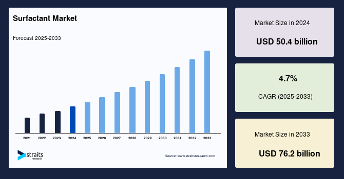 According to StraitsResearch, the global surfactant market size is valued at USD 50.4 billion in 2024 and is estimated to reach USD 76.2 billion by 2033, growing at a CAGR of 4.7% during 2025-2033.